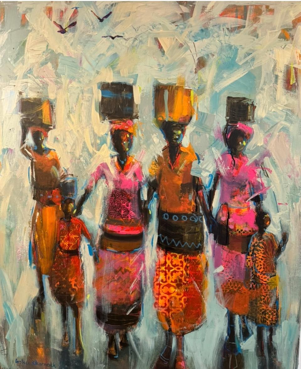 Lesley Charnock is a South African artist born in 1952 who has become well known for depicting quintessentially South African scenes in oils and acrylics. Working in an impressionistic style, she captures landscapes of the Cedarberg, Klein Karoo, and Pondoland, often featuring people in their daily lives—traveling in donkey carts, harvesting fields, or walking dusty roads. Her work is characterized by dramatic tonal contrasts, loose brushstrokes, and warm colors that capture the distinctive African light.